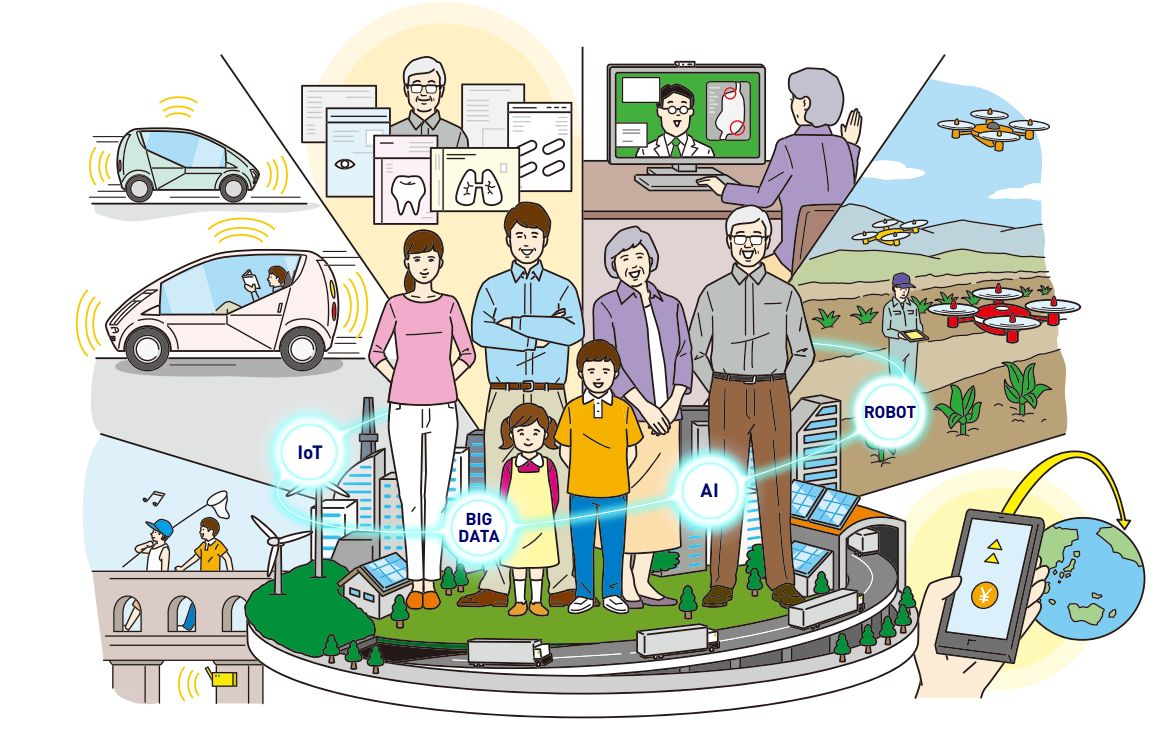 Третью промышленную революцию можно описать как информационную революцию, и в эпоху компьютеров и их сетей многие офисные рабочие места были автоматизированы. Компьютеры и их сети подобны нервам в человеческом теле, и мы можем сказать, что функции человеческих нервов расширяются благодаря развитию ИИ и Интернета вещей. Если Первая промышленная революция принесла обществу мышцы и скелеты, Вторая промышленная революция принесла кровеносные сосуды, Третья промышленная революция принесла нервы, а грядущее Общество 5.0 приведет к слиянию мышц, кровеносных сосудов и нервов.