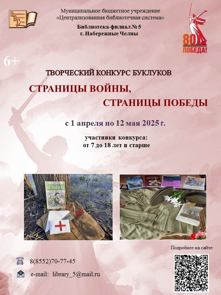 С 1 апреля по 12 мая 2025 года МБУ «Централизованная библиотечная система» приглашает желающих от 7 до 18 лет и старше принять участие в творческом конкурсе буклуков «Страницы войны, страницы Победы», посвященный 80-й годовщине Победы в Великой Отечественной войне и Году Защитника Отечества. На Конкурс принимаются фотографии книжных композиций на тему Великой Отечественной войны. «Буклук» от англ. «book» – книга «look» – это снятая фотокамерой композиция, центральным элементом которой является книга, где разрешено использование выразительных средств, подходящих теме. «Буклук» – это книжный натюрморт. Конкурс предусматривает создание композиции, центральным элементом которой является книга о войне. Приветствуется использование различных атрибутов для оформления, элементов декора. Прием конкурсных работ до 12 мая 2025 года включительно на электронный адрес library_5@mail.ru Телефон для справок: (8552) 70 -77- 45 Положение смотрите на нашем сайте: https://библиотека-челны.рф/konkursy-i-ak