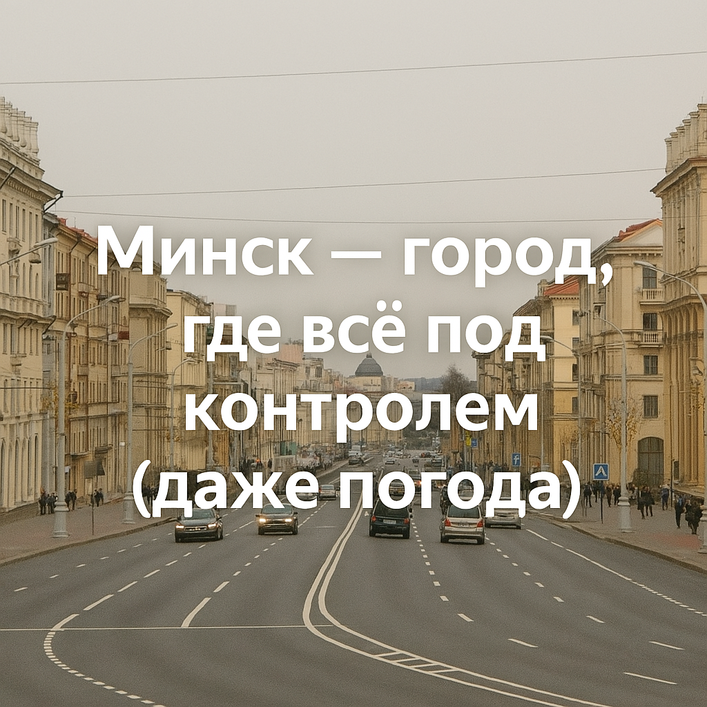 Минск — город, где всё под контролем (даже погода) Говорят, Минск — это один из самых спокойных городов на планете. И если где-то резко захлопнется дверь, соседи не пугаются — просто уточняют, не пришла ли наконец стипендия. Город чистый. Настолько чистый, что если уронить бумажку, она либо улетит сама в урну, либо кто-нибудь доброжелательно вернёт вам её с лёгким укором: