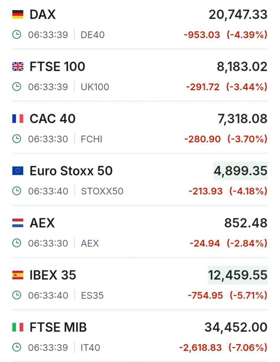 Китай вводит ответные пошлины в размере 34% на все товары из США в ответ на тарифы, введенные Трампом. Европейские фондовые рынки резко снижаются, при этом наибольшее падение наблюдается в Италии, Испании и Германии. 👉🏻Новости №1 в Ростове 💌Прислать новость/фото