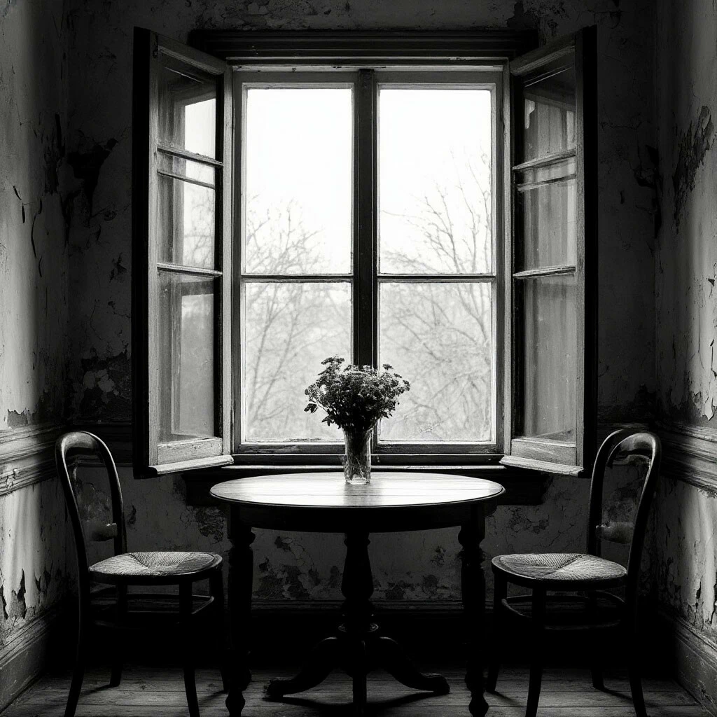 За печально пустым, деревянным столом.