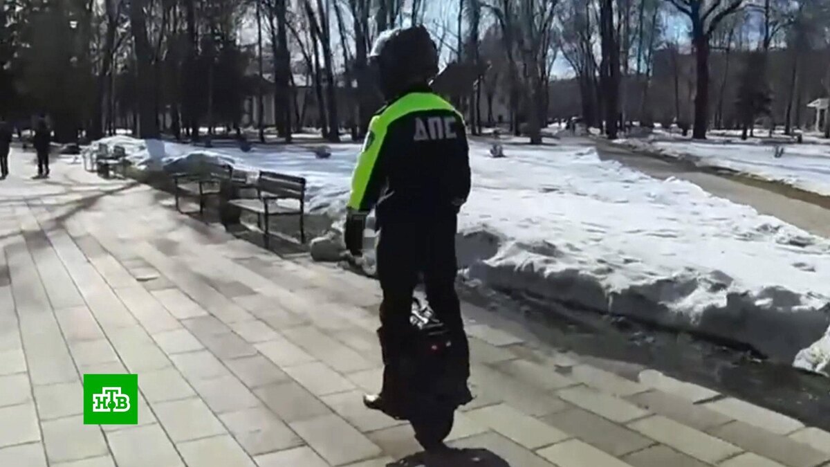 [ Смотреть видео на сайте НТВ ] 28-летний житель Башкирии решил заняться профилактикой правонарушений, но способ выбрал незаконный. Молодой человек нарядился в форму сотрудника ДПС и на моноколесе патрулировал местный парк, делая выговор самокатчикам, при этом сам нарушал правила. В итоге его остановили настоящие полицейские. В Уфе пожаловались на «инспектора ДПС», бороздящего городские просторы на моноколесе. Если это страж порядка, почему сам нарушает? На такой скорости по парку? В ГИБДД заявили, что это не их сотрудник. Мужчину нашли, остановили и попросили представиться. Тот в ответ признал, что правоохранителем не является, но очень хочет приучить людей на электросамокатах соблюдать правила. Для этого и устроил маскарад. Никита, нарушитель: «Они перемещаются по городу вдвоем на одном самокате, не спешиваются на пешеходных переходах. При моем виде они стали чаще спешиваться, хотя бы просто из-за моего вида. Я им ничего не говорю, просто показываю пальчик». Настоящие инспекторы ДПС