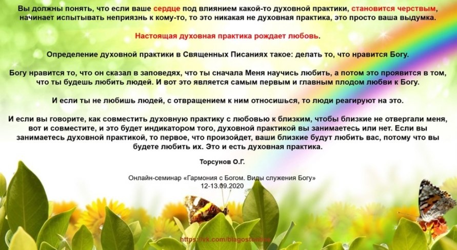 Вы должны понять, что если ваше сердце под влиянием какой-то духовной практики, становится черствым, начинает испытывать неприязнь к кому-то, то это никакая не духовная практика, это просто ваша выдумка. НАСТОЯЩАЯ ДУХОВНАЯ ПРАКТИКА РОЖДАЕТ ЛЮБОВЬ. Определение духовной практики в Священных Писаниях такое: делать то, что нравится Богу. Богу нравится то, что он сказал в заповедях, что ты сначала Меня научись любить, а потом это проявится в том, что ты будешь любить людей. И вот это является самым первым и главным плодом любви к Богу. И если ты не любишь людей, с отвращением к ним относишься, то люди реагируют на это. И если вы говорите, как совместить духовную практику с любовью к близким, чтобы близкие не отвергали меня, вот и совместите, и это будет индикатором того, духовной практикой вы занимаетесь или нет. Если вы занимаетесь духовной практикой, то первое, что произойдет, ваши близкие будут любить вас, потому что вы будете любить их. Это и есть духовная практика.