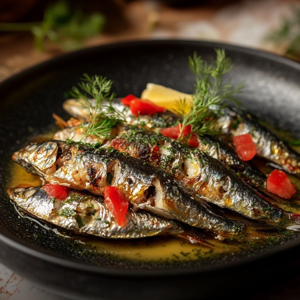 Создано на основе запроса: realistic image of sardines served on plate in a restaurant ready to be eaten