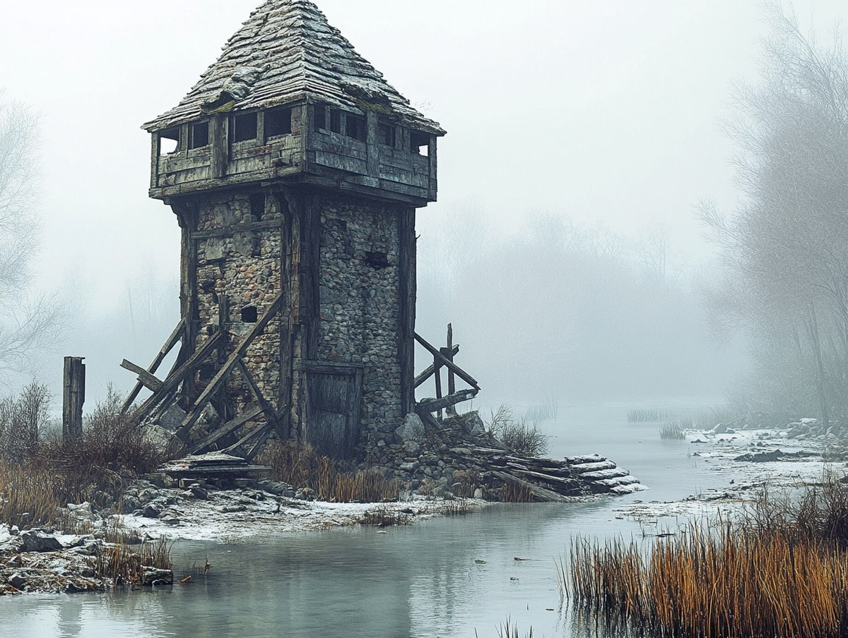 Создано на основе запроса: medieval guard tower made of old stone next to a foggy swamp