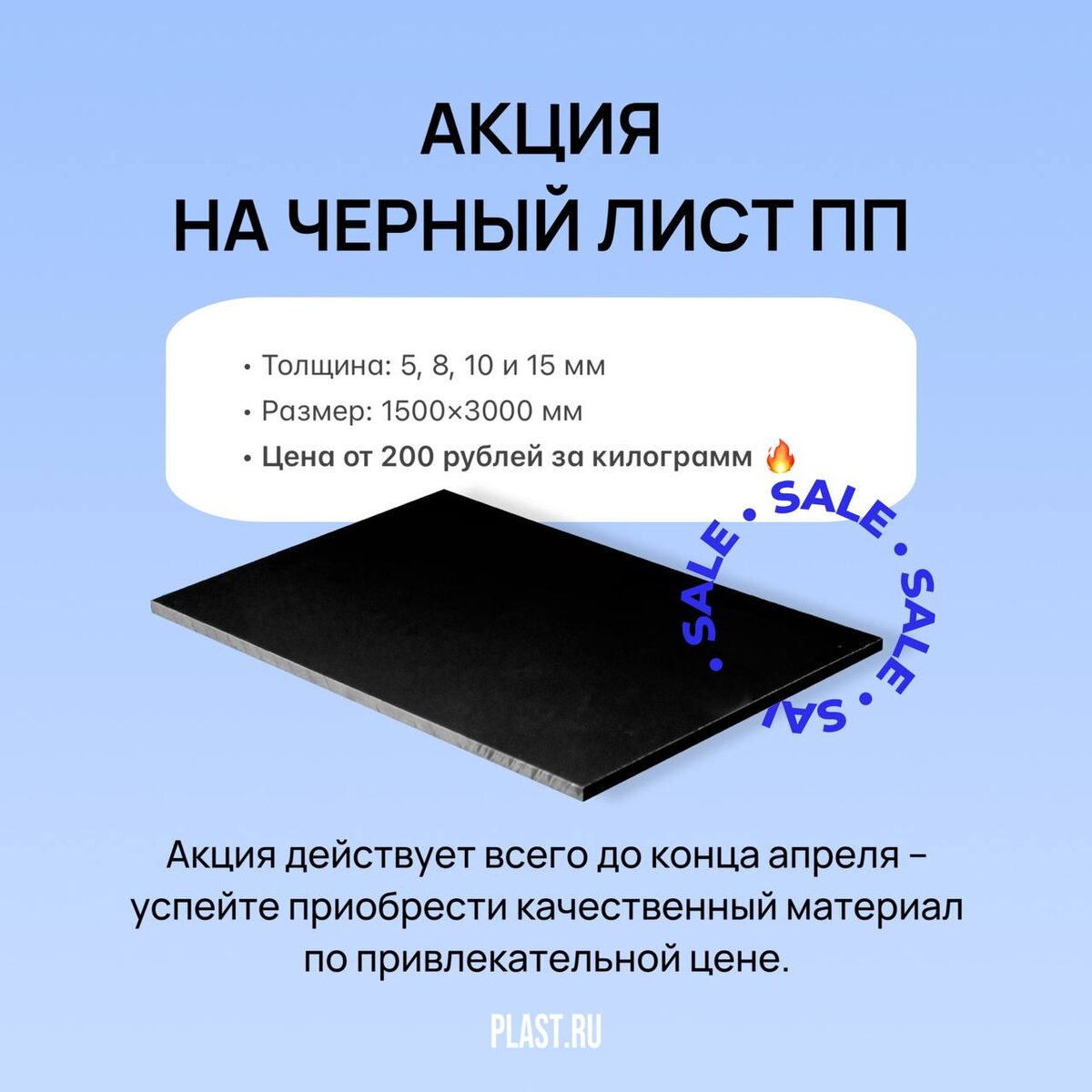 🔔Апрель радует нас теплой погодой, а мы радуем вас акцией до конца месяца! АКЦИЯ НА ЧЕРНЫЙ ЛИСТ ПП (полипропилена): • Толщина: 5, 8, 10 и 15 мм • Размер: 1500×3000 мм • Цена от 200 рублей за килограмм 🔥 Радуемся весне и выгодным покупкам одновременно! Акция действует всего до конца апреля – успейте приобрести качественный материал по привлекательной цене. 🤙 Звоните прямо сейчас! ⛓ Оставьте заявку на сайте 📍 Доставим в удобное для вас время Контакты для заказа +7 (495) 479-00-00 +7 (800) 555-52-54 info@plast.ru