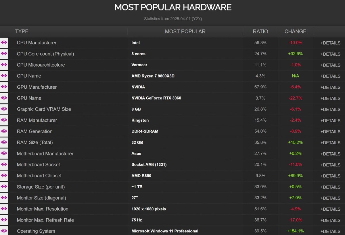 Данные из отчётов CPU-Z за первый квартал 2025 года указывают на значительный сдвиг на рынке процессоров: системы с 8-ядерными процессорами теперь приходятся на 24,7% от всех проверок, чаще всего в отчётах фигурирует AMD Ryzen 7 9800X3D, — сообщает VideoCardz со ссылкой на ряд источников. Эта тенденция совпадает с заметным увеличением общей популярности процессоров AMD, которые фигурируют в 43,7% отчётов, что на 16,6% больше относительно прошлого года, в то время как доля отчётов с процессорами Intel снизилась на 10% — до 56,3%. Данные отчётов также отражают меняющиеся предпочтения в отношении мониторов и видеокарт. Источник изображения: valid.x86.fr Рост сегмента 8-ядерных процессоров особенно заметен — пользователи всё чаще предпочитают процессоры с увеличенным количеством ядер для игр и требовательных приложений. AMD Ryzen 7 9800X3D, выпущенный ранее в этом году, считается ключевым фактором роста — он очень популярен благодаря своей производительности, соотношению цены и характерист