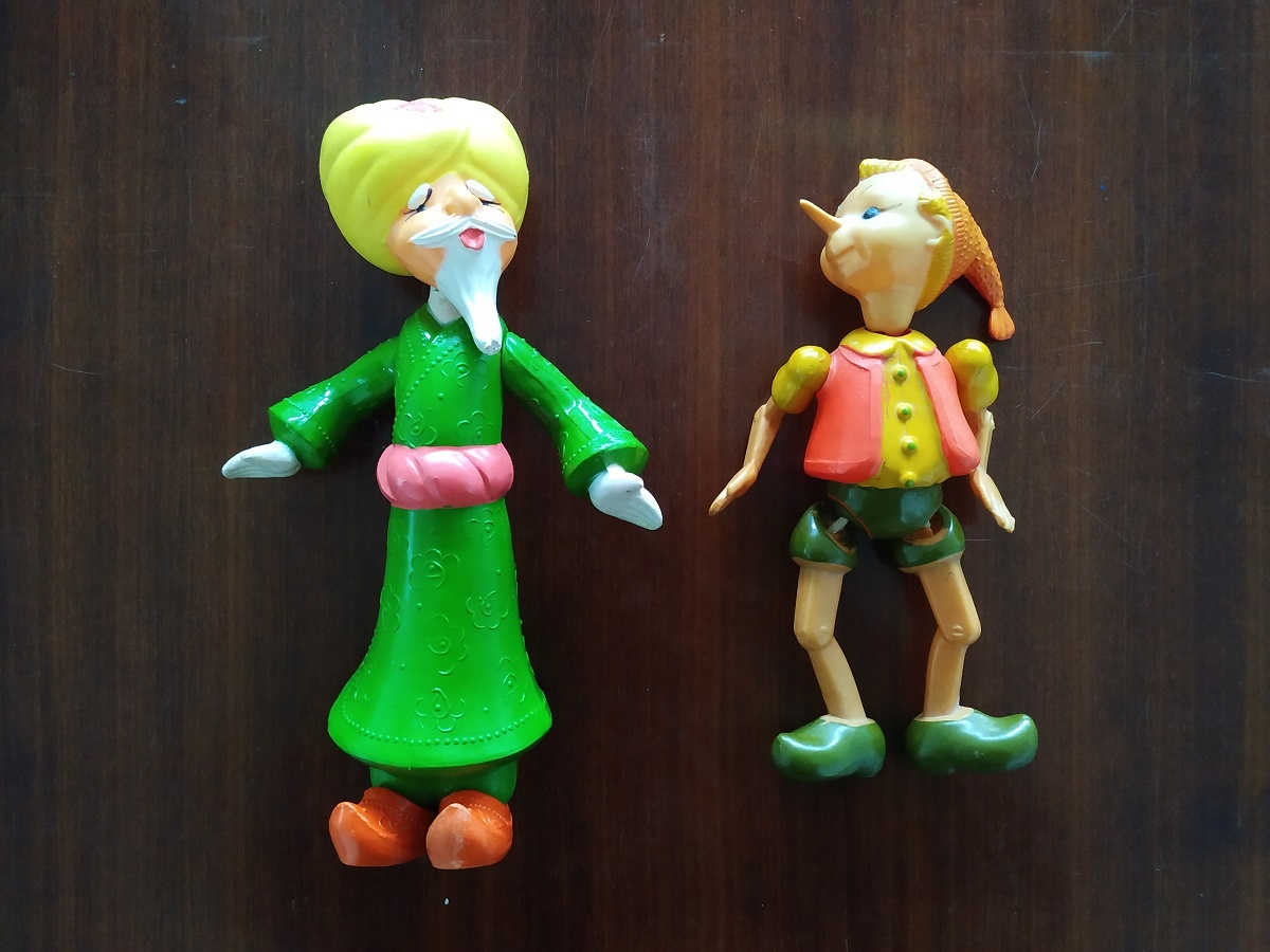 Большинство игрушек в нашей "Студии" 70-х и 80-х годов. По нашей теории, до того игрушек было мало, и их передавали дальше, другим детям. Ну а после 80-х, наоборот, игрушек стало слишком много, и их перестали ценить и хранить. Но иногда в наш "Дом престарелых" попадают и более ранние экземпляры. Эти Хоттабыч и Буратино из целлулоида, и вероятно, сделаны в 50-х или 60-х годах. И что самое приятное, они оба полностью комплектные, и даже растянутые резинки - оригинал. Оба сказочных персонажа уже на полках и радуют гостей!