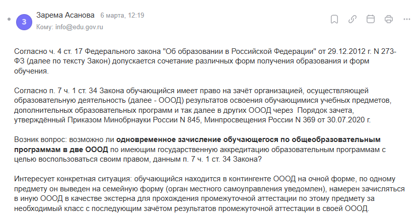 Сам запрос на фото, вот как он был сформулирован: "Возможно ли одновременное зачисление обучающегося по общеобразовательным программам в две организации, осуществляющие образовательную деятельность (далее - ОООД) по имеющим государственную аккредитацию образовательным программам с целью воспользоваться своим правом на зачёт результатов из другой ОООД при сочетании форм (ч. 7 ст. 34 Закона об образовании)?" Уточнила в запросе, что дело касается ребёнка, который находится в контингенте на очной форме, а по одному предмету выведен на семейную форму и намерен зачисляться в иную ОООД в качестве экстерна для прохождения промежуточной аттестации (далее - ПА) по этому предмету за необходимый класс с последующим зачётом результатов ПА в своей ОООД. Что ответило ведомство, тезисно: 🟣Образование в РФ может быть получено в ОООД и вне ОООД (ст. 17 Федерального закона "Об образовании в Российской Федерации" от 29.12.2012 г. № 273-ФЗ, далее -Закон об образовании); 🟣Форма получения общего образовани