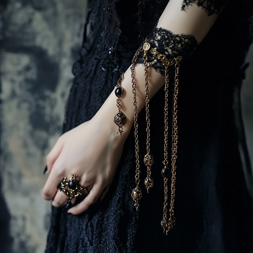 Создано на основе запроса: Golden necklace with long cycled chain hanging on the arm, Gothic style, dark colors