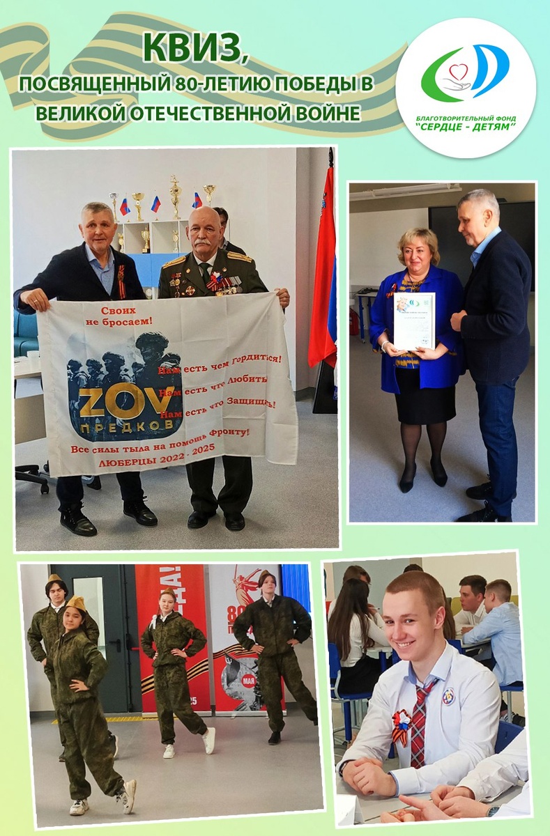 28 марта в гимназии № 56 (г. Люберцы) прошел финальный этап историческо-патриотического Квиза, посвященного 80-летию Победы в Великой Отечественной войне. С гордостью делимся впечатлениями с мероприятия. Квиз был организован для учащихся10-х классов благотворительным Фондом «СЕРДЦЕ - ДЕТЯМ» совместно с Администрацией Люберецкого городского округа. Он объединил более 400 участниковиз 22 образовательных учреждений района. Коллектив Фонда подготовил для квиза кейс из 200 вопросов, содержание которых держалось в строжайшей секретности. Нашейзадачей было пробудить у старшеклассников интерес к истории страны, укрепить знания о Великой Отечественной войне, внести вклад в патриотическое воспитаниемолодежи. 7 марта ребята состоялся конкурсный отборочный этап на базе собственных школ, а 21 -встретились друг с другом в полуфинале на 4-х нейтральных площадках. Финал прошел в торжественной и волнительной обстановке. Четыре команды-чемпиона продемонстрировали глубокиезнания об исторических персонах