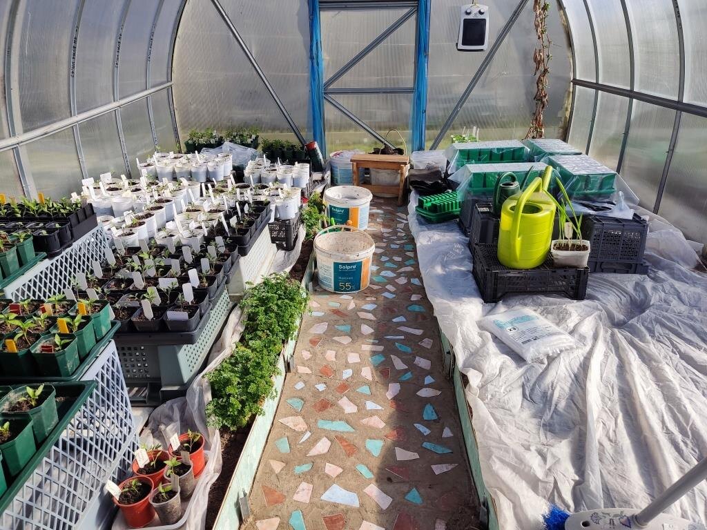 Осталось сказать, что главный у меня вопрос: переносить всё домой на время? Или рискнуть и оставить? Накрыть получше в несколько слоев — и пусть рассада закаляется? Пока склоняюсь к тому, чтобы оставить.