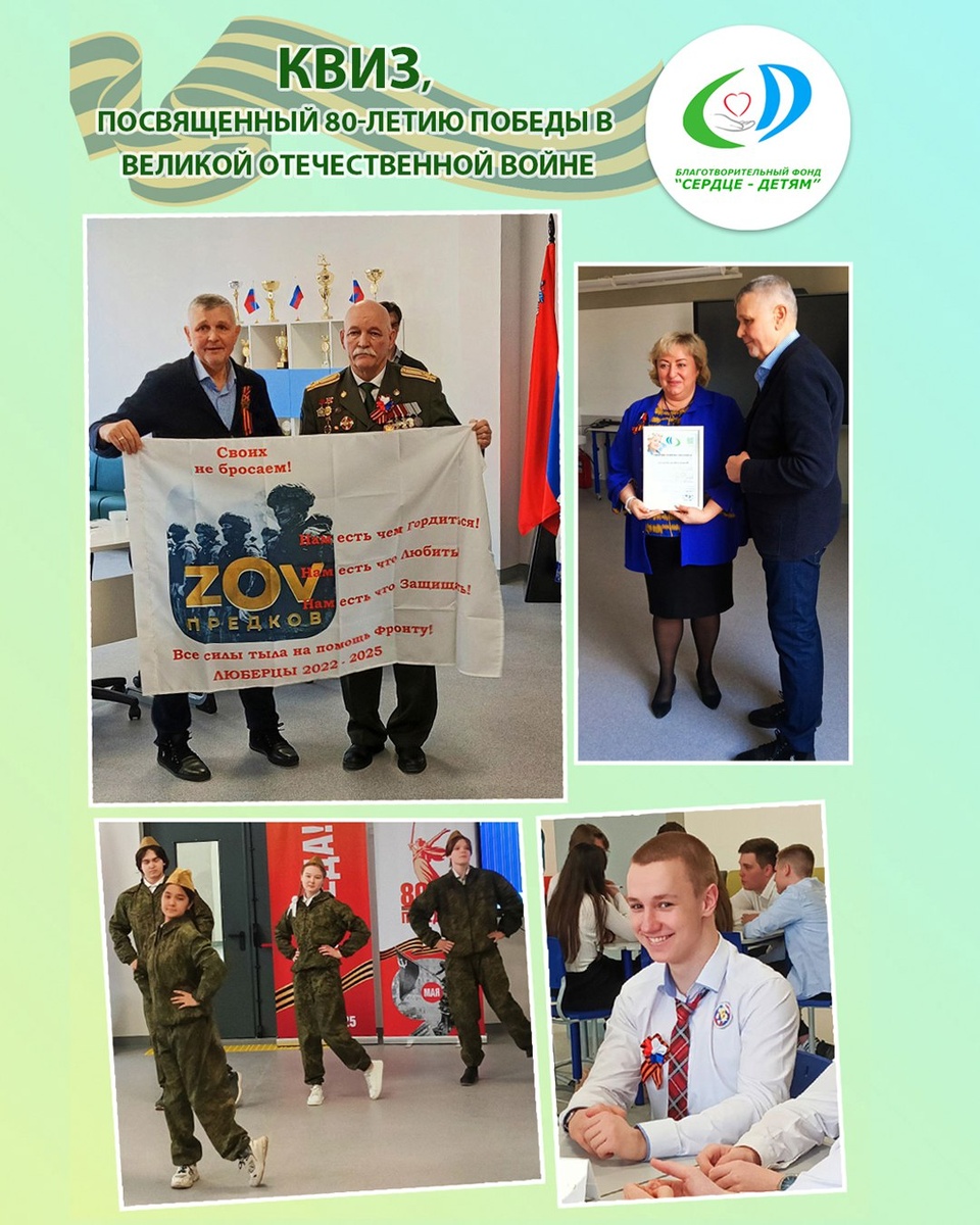 28 марта в гимназии № 56 (г. Люберцы) прошел финальный этап историческо-патриотического Квиза, посвященного 80-летию Победы в Великой Отечественной войне. С гордостью делимся впечатлениями с мероприятия. Квиз был организован для учащихся 10-х классов благотворительным Фондом «СЕРДЦЕ - ДЕТЯМ» совместно с Администрацией Люберецкого городского округа. Он объединил более 400 участников из 22 образовательных учреждений района. Коллектив Фонда подготовил для квиза кейс из 200 вопросов, содержание которых держалось в строжайшей секретности. 🇷🇺 Нашей задачей было пробудить у старшеклассников интерес к истории страны, укрепить знания о Великой Отечественной войне, внести вклад в патриотическое воспитанимолодежи. 7 марта состоялся конкурсный отборочный этап на базе собственных школ, а 21 – ребята встретились друг с другом в полуфинале на 4-х нейтральных площадках. Финал прошел в торжественной и волнительной обстановке. Четыре команды-чемпиона продемонстрировали глубокие знания об историче