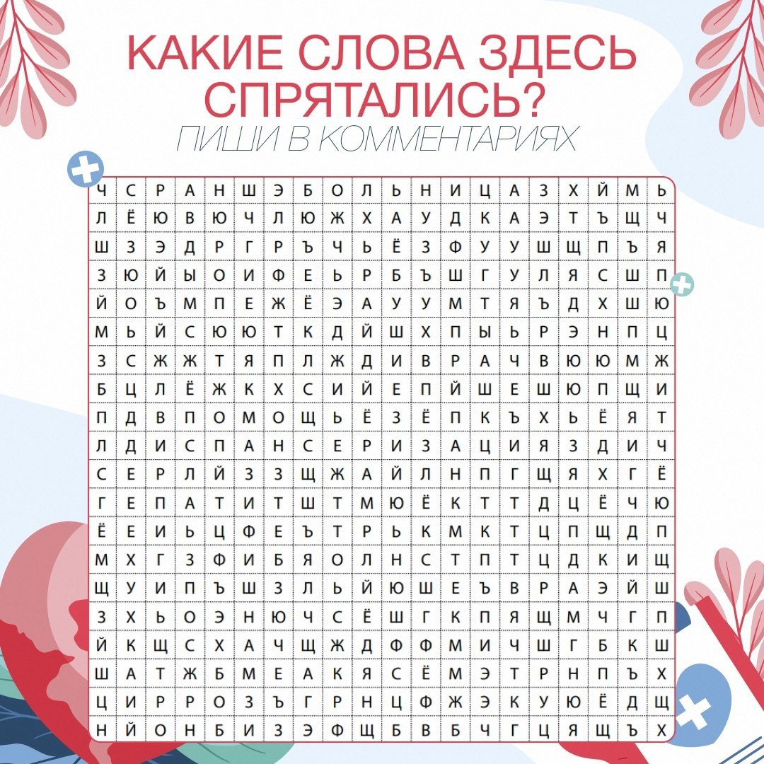 🧩Давайте вечером немного отвлечемся от суеты и поиграем Правила игры: 🩺Найдите шесть слов на медицинскую тематику, которые мы спрятали на картинке. 🩺Пишите в комментариях, что это за слова. 🩺Ставьте лайк, если удалось справиться. Начнем? #здоровье_96
