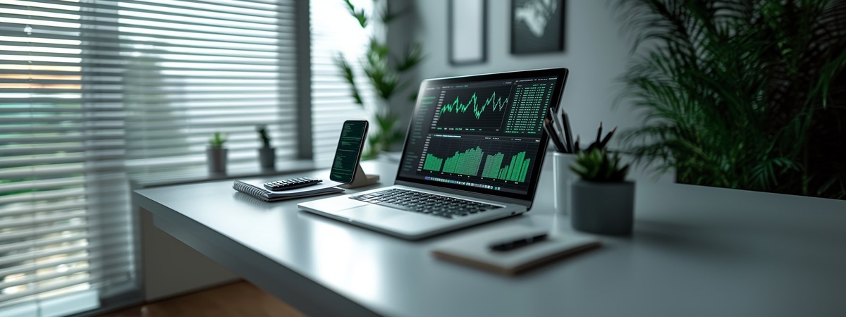 Создано на основе запроса: A clean white minimalist workspace with a white desk, trading tools placed neatly: a laptop and a smartphone both displaying green ascending trading charts, a modern pen, an open notebook, and a sleek calculator. Bright soft lighting, light background, pure minimal aesthetic, atmosphere of profit, wealth and focus, top-down view