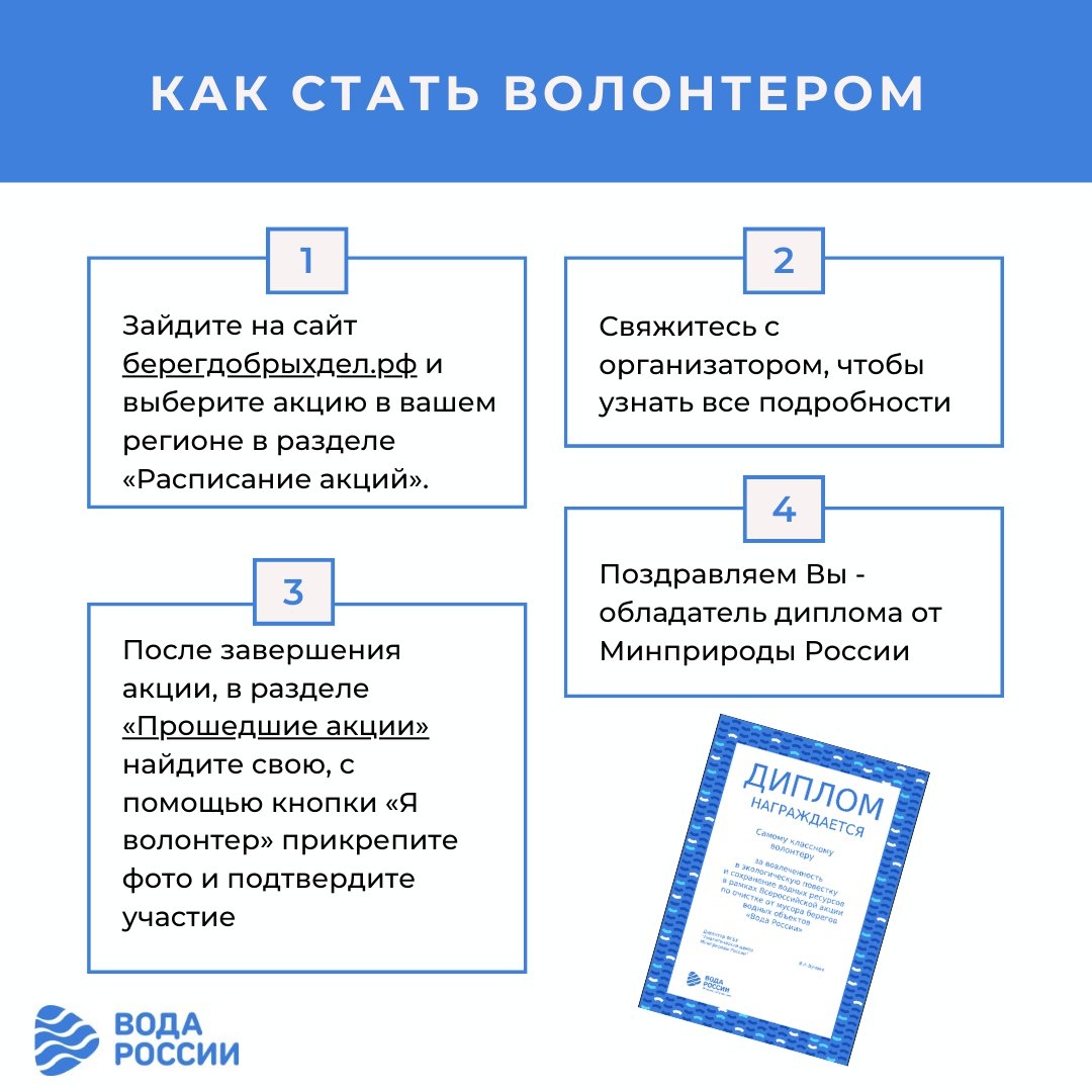 Задумывались о том, как внести свой вклад в защиту окружающей среды? 🌍Начинается сезон акций "Вода России", и это идеальное время для старта! Здесь вы узнаете, как стать волонтером или организатором этой замечательной инициативы В прикрепленных картинках — пошаговая инструкция. И помните, за каждым вашим шагом стоит возможность больших перемен! Подробнее на сайте