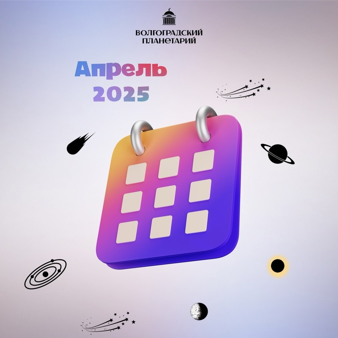 ................................................ АСТРОСОБЫТИЯ В АПРЕЛЕ 2025 ГОДА #астрономическиесобытия ................................................ ㅤ ㅤ 4 апреля - Северное склонение Луны (Телец); 5 апреля - Первая четверть Луны; 9 апреля - Стояние Венеры, переход к прямому движению; 10 апреля - Луна пересекает нисходящий узел (Дева); 13 апреля - Полнолуние; 14 апреля - Луна в апогее; 15 апреля - Солнце пересекает меридиан в 12:01; 17 апреля - Марс в афелии; 18 апреля - Наибольшее южное склонение Луны (Стрелец); 21 апреля - Последняя четверть Луны; утренняя элонгация Меркурия (не видно); 22 апреля - Максимум Лирид (18 в час); 25 апреля - Луна пересекает восходящий узел (Рыбы); утром Венера, Луна, Сатурн в секторе неба 4о 20’; 27 апреля - Луна в перигее; Новолуние; 29 апреля - Начало вечерней видимости Луны. 🚀 Космос ближе, чем кажется - ПОДПИСАТЬСЯ - Волгоградский планетарий