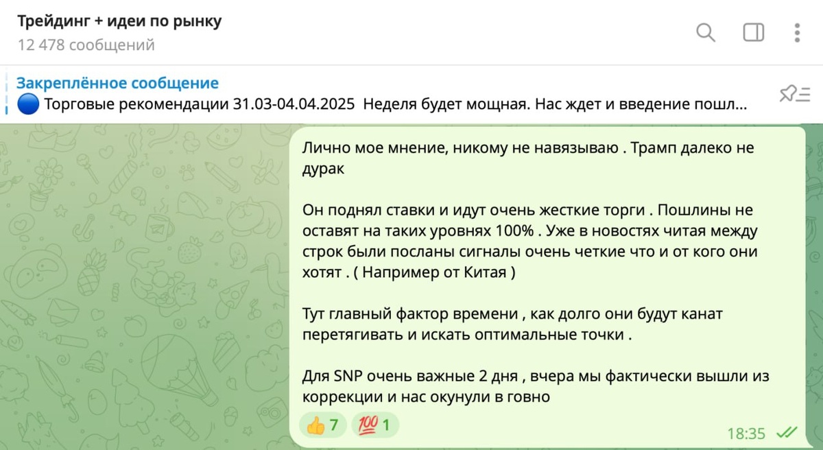 В ответ на пост Вчера в клубе написпал такое мнение Пока объявления тарифов Трампом были блефом (зеленые и желтые строки против красных). Посмотрим что он теперь ответит Китаю , это наверно самый важный этап этой войны Это рынок , возможно ВСЕ и сильные поддержки по SNP у нас будут на 5100 первая . Мы можем хоть год падать с отскоками , но ЛИЧНО я жду скорейших договоренностей