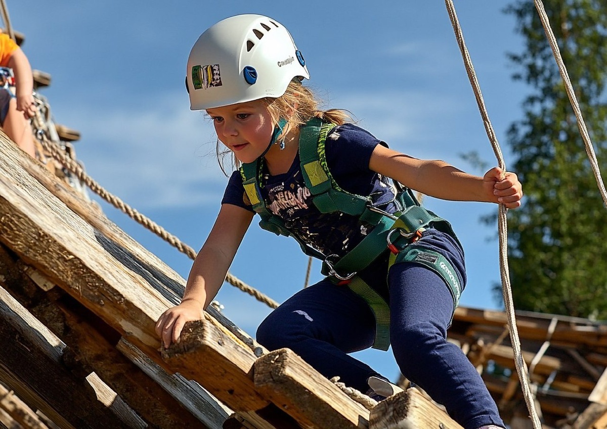 Создано на основе запроса: A young girl wearing navy blue pants, a white helmet, and a green safety harness is climbing up the wooden cargo course structure with ropes in her hands at a summer camp in Sweden. This is a real photo taken by a Canon EOS camera, using a wide-angle shot on a sunny day.
