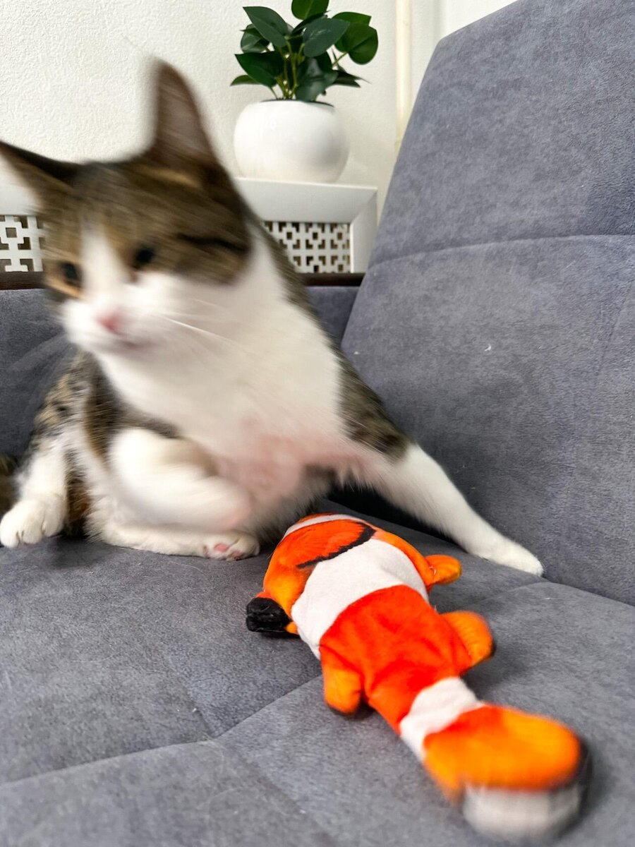 Рыбка продаётся на всех маркетплейсах, её можно найти по запросу «интерактивная игрушка-рыба». Стоит в районе 250 - 400 рублей, работает от встроенного аккумулятора. В комплекте к ней идет проводок для зарядки и пакетик кошачьей мяты. Несмотря на то, что рыбки - это любовь, автоматическую рыбину Мята испугалась. Механизм у рыбки работает шумно, плюс удары хвостом по полу создавали дополнительный грохот, от которого Мята убежала прятаться в когтеточку. Я несколько раз предлагала Мяте игрушку, но она её так и не заинтересовала. Ника не любит активные игры, она дама вальяжная, любит поваляться и поохотиться на птичек за окном. К рыбе она оказалась абсолютно равнодушна, игрушка у неё не вызвала даже малейший интерес. Она на неё посмотрела и отправилась дальше заниматься своими делами. Аляска - самая смелая кошка из в
