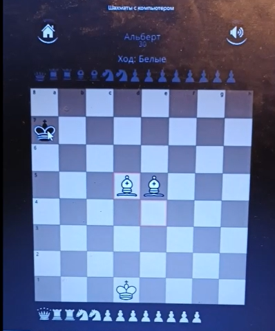Играла он-лайн. Соперник Альберт. Хорошо играли. Фигуры биты. Вот сейчас Альберт легко поставит мне Мат. Думала я. У Альберта преимущество. У него два Слона!!! И Король! Тоже не хилая фигура. Но почему то Король Альберта совсем не ходил???, а стоял на одном месте. И вот, гонял Альберт моего Короля двумя Слонами, гонял, а Мат поставить никак НЕ МОЖЕТ. 1) Начало конца нашей партии. 2) Альберт сходил Слоном. 3)Я сходила Чёрным Королём. 4) Альберт сходил Слоном. 5) Я напала на Слона. 6) Альберт убрал Слона из-под удара.. И дальше, у нас пошло по кругу. Король Альберта стоял на месте. Бесполезно. Ночь. Извини, Альберт, я пошла спать. Не дождусь. *** На следующий день, мы в семье, дома, на доске разыграли ту, Альбертову партию. Вернее, окончание партии. И пытались поставить Мат Чёрному Королю. Действительно, тяжело. Несмотря на то, что наш Белый Король совместно со Слонами стал активно загонять Чёрного Короля в угол. Удалось добиться только патовой ситуации. А вот МАТ?.... Никак.