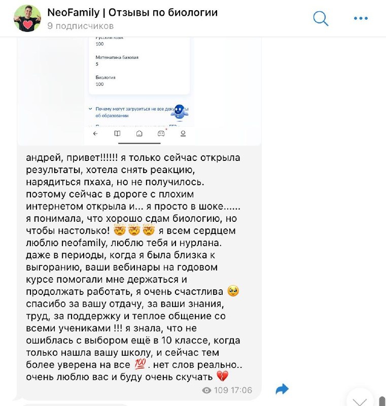 Котятки! Внезапно вспомнил, что в прошлом году мы сделали тгк с кучей отзывов на мои курсы 😶 Тут собраны не только стобалльники, но и ребята, которые смогли за короткое время набрать 50, 60 баллов! Потому что я не пытаюсь сделать вид, что каждый на моих курсах получает 90+. Зато я точно знаю, что каждый, кто реально учится на моих курсах — получает желаемый результат! Почитайте и вдохновитесь историей подготовки этих мощнейших ребят — наших выпускников 2024 сезона https://t.me/neofamily_bio_reviews