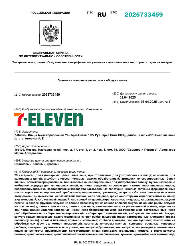 Компания 7-Eleven, управляющая сетью магазинов формата "у дома", подала заявку на регистрацию товарного знака в Роспатент. 7-Eleven может вновь задуматься о выходе на российский рынок. Пока о планах компании официально не сообщалось, но, по данным Роспатента, 2 апреля она подала заявку на регистрацию товарного знака в РФ. 7-Eleven Inc. – американская компания, основанная в 1927 году в Далласе. Представляет собой сеть магазинов продуктов, промтоваров и готовой еды. Изначально работала с 7 до 11 часов, отсюда и название. В настоящее время большая часть магазинов — круглосуточные. С 2005 года 7-Eleven Inc. является "дочкой" японской компании Seven-Eleven Japan (входит в холдинг Seven & I Holdings). Сеть насчитывает около 83,5 тыс. магазинов в 19 странах. В 2013 году, российские власти планировали выделить около 200 помещений для размещения магазинов шаговой доступности под брендом 7-Eleven. Однако компания не смогла договориться с российской стороной об условиях сотрудничества и отказалас