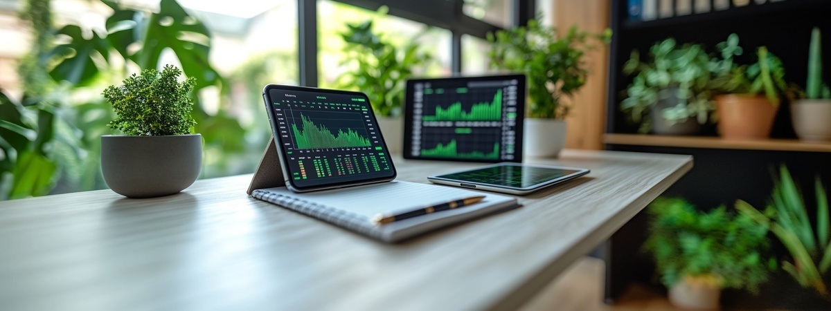 Создано на основе запроса: a clean and minimalistic forex trading desk on a white table, a smartphone displaying green trading charts, a