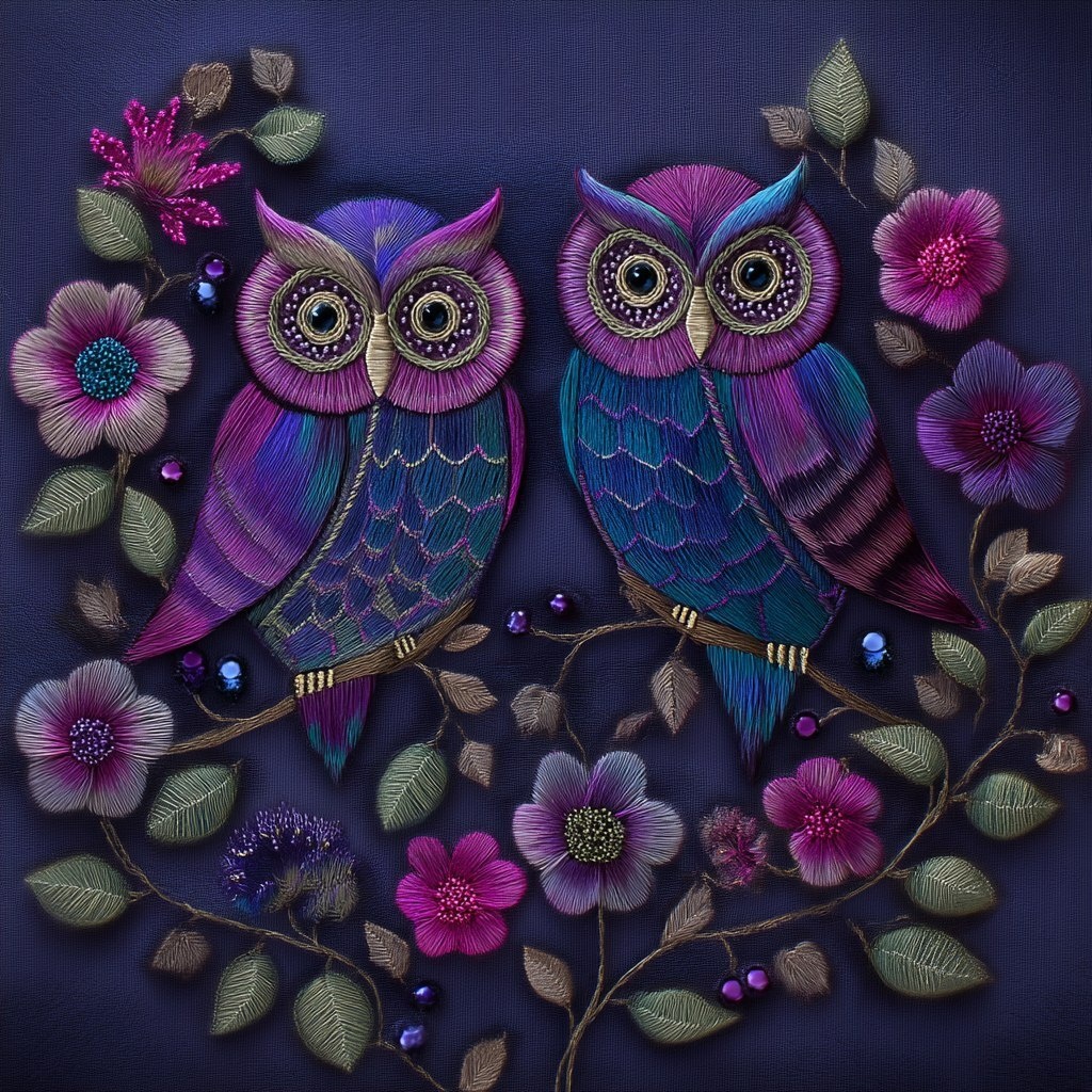 Создано на основе запроса: fiber optic floral owls in swedish folk art style, purples, blues, pinks, green accent color, ethereal, translucent embroidery with fiberoptic thread