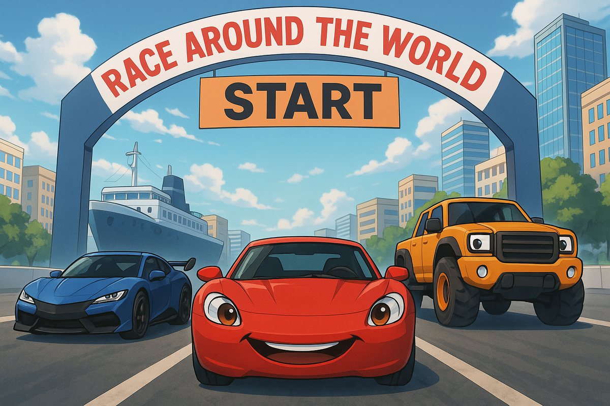 Глава 1. Старт большого приключения В городе наступил особенный день — старт международного ралли «Гонка вокруг света»! Гонщики со всего мира собрались, чтобы принять участие в этом грандиозном соревновании, которое проходило в разных странах. Среди них был и наш герой — Спиди, стремительный и отважный гоночный автомобиль, а также его друзья: Электра — молниеносная спортивная машина, и Биг Ролл — массивный внедорожник, способный преодолеть любые препятствия. Соперники были не менее сильны. Турбо — хитрый и быстрый суперкар, который всегда использовал трюки, чтобы прийти первым. С ним выступал его напарник Вихрь, аэродинамический гиперкар, любящий скорость и риск. В гонке также участвовала Нитро — ярко-красная машина с реактивным ускорителем, способная развивать невероятную скорость. Первый этап гонки проходил в Турции, стране с богатой историей и потрясающими ландшафтами. Гонщики погрузились на огромный корабль, и вскоре их встречал Стамбул — город двух континентов. Глава 2.