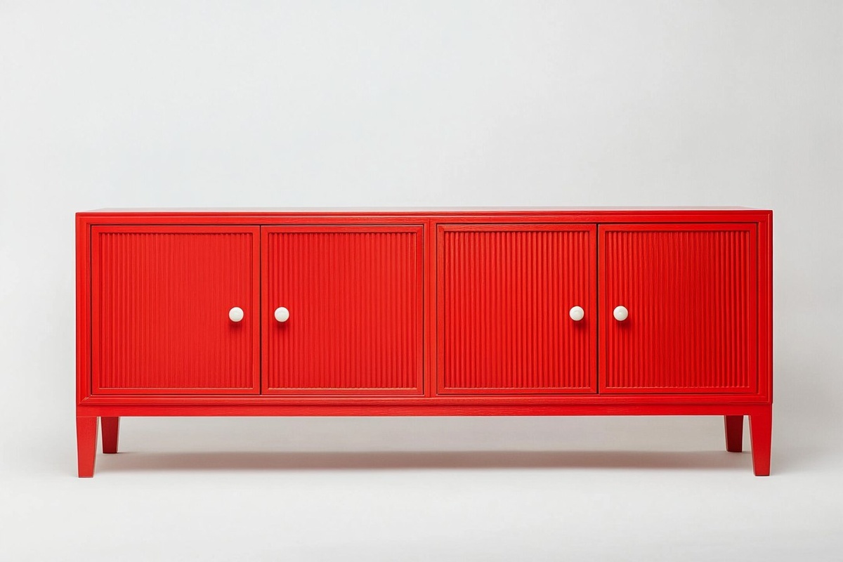Создано на основе запроса: study chest credenza sideboard, long 4 door, laquuered, bright red color, reeded wood doors, knobs, modern, white