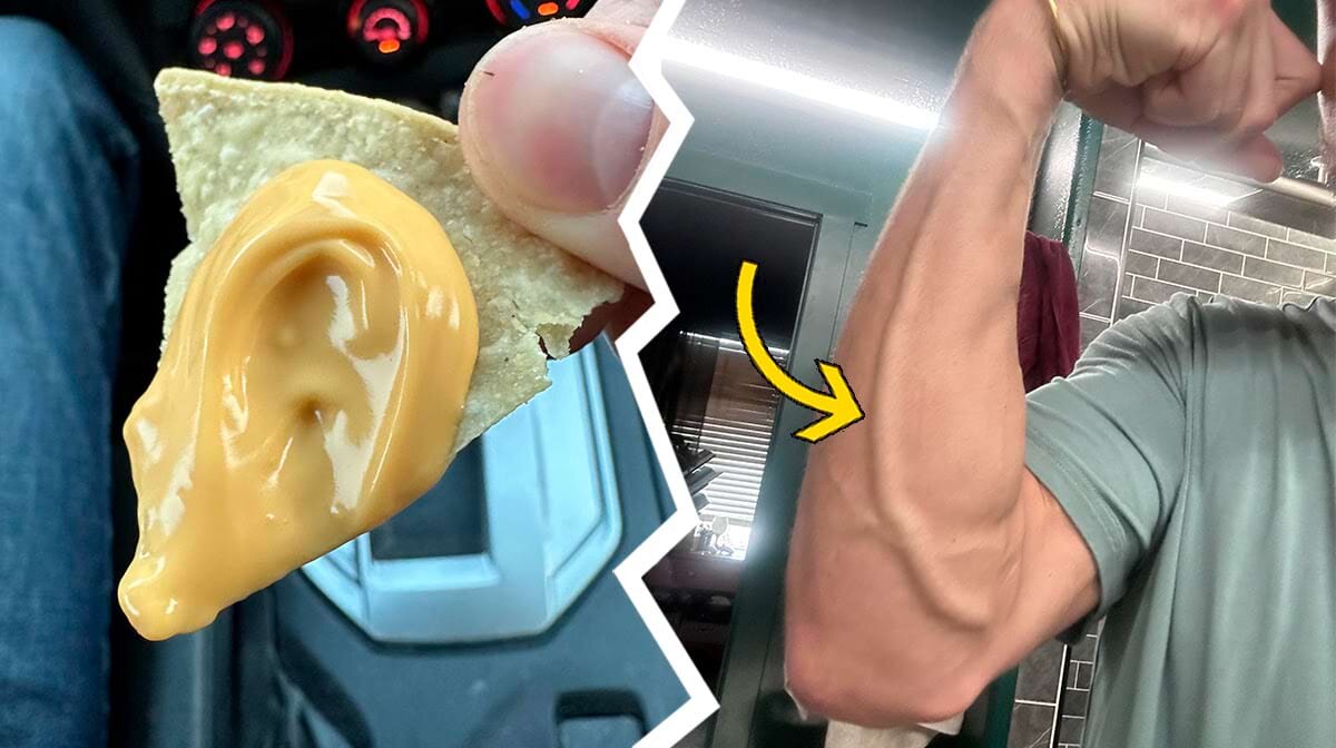 «Это была моя последняя чипсина, и я хотел креативно намазать на неё сыр для начос, не касаясь её, поэтому я подул на соус ртом. Каким-то образом воздух, который я выдул, образовал на чипсине эту реалистичную форму уха. Да, я съел её. Да, сыр для начос — это не настоящий сыр», — написал автор фото 👂