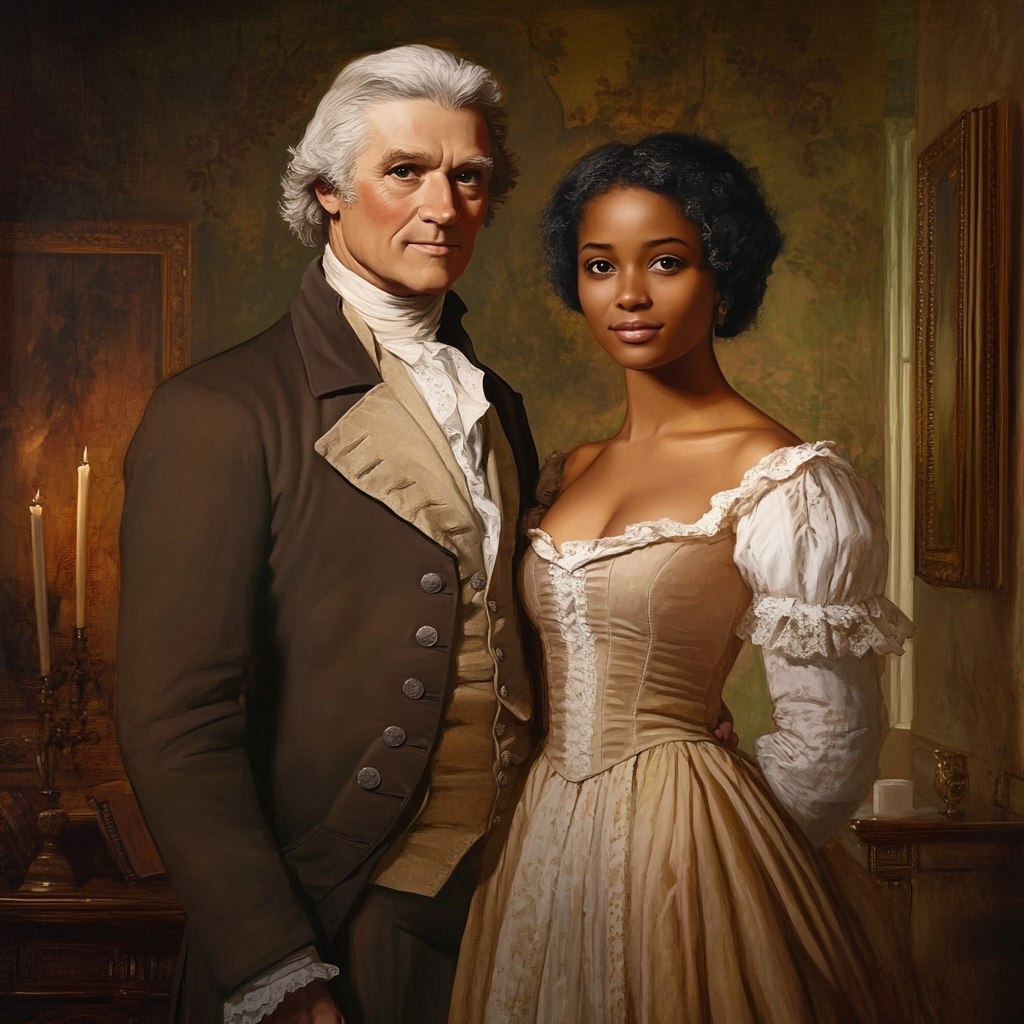 Создано на основе запроса: A realistic historical painting of Thomas Jefferson standing beside Sally Hemings in the late 18th century. Jefferson, a tall, distinguished Caucasian man with white hair, is dressed in an elegant colonial-era suit. Sally Hemings, an African-American woman with light brown skin and soft features, wears a modest 18th-century dress. They are in a dimly lit room at Monticello, with candlelight casting a warm glow. Jefferson has a thoughtful expression, while Hemings looks reserved. The atmosphere is intimate but formal, evoking the complexity of their historical relationship.