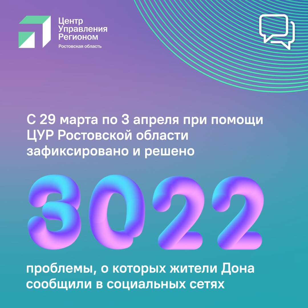 ✅Поговорим о статистике решенных проблем за неделю. 📌С 29 марта по 3 апреля при помощи ЦУР Ростовской области зафиксировано и решено 3 022 проблемы, о которых жители Дона сообщили в социальных сетях Подробнее сможете узнать из наших карточек🔜 #цур61 #решаемвместе61 #цурвцифрах #ростовскаяобласть