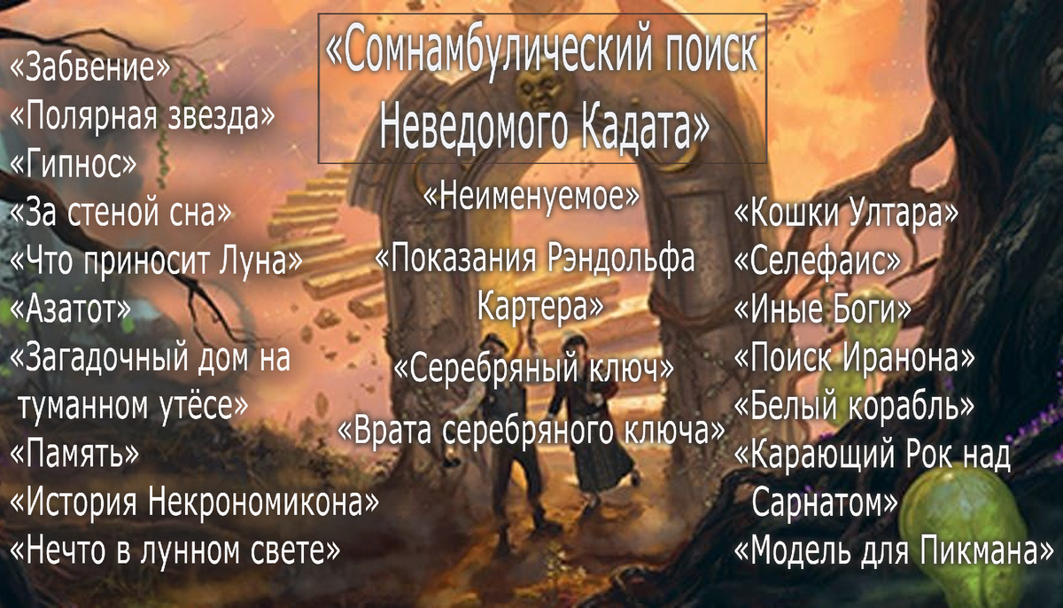 Что ж, вот в таком хронологическом порядке я предлагаю вам прочитать/прослушать сновидческий цикл. Если цикл понравился, открываете картинку, выбираете рассказ, вбиваете в поиске Ютуба «название рассказа» + «аудиокнига лавкрафт» и выбираете нужный вариант.