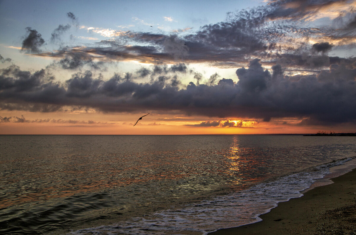 Закончились стройные ряды гаражей, ещё один поворот, подъём на песчаный пригорок с которого видно море. Вот оно возникло перед глазами, разлилось ярким оранжевым заревом вдоль горизонта, раскинулось широко в янтарных переливах заходящего осеннего солнца!
