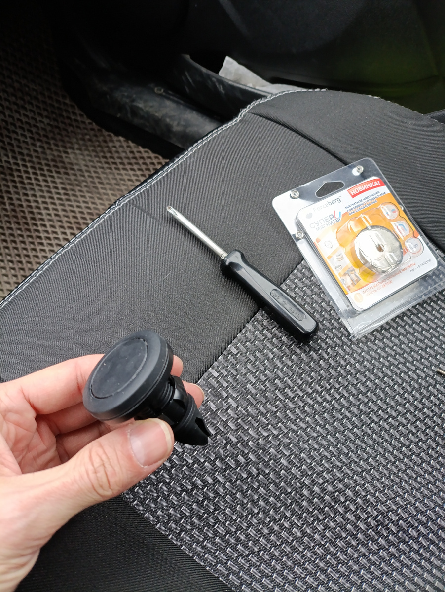 Небольшое предисловие. Магнитный держатель куплен был давно. Он держит до 200 грамм. Старый телефон весил 220 грамм. И падал, но не так часто, мне казалось что я его рукой сбивал. А вот новый телефон 240 грамм. И вот тут то сил магнита не хватило. Телефон на любой неровности улетал вниз. Первым улучшением было я вставил два меленьких магнита под саму пластину чехла. Но не помогло. Поэтому следущим шагом стало поменять магнит. Вот жалко что не нашлось на М3 гаек, пришлось брать то что было М4. И даже без каких либо доработок все плотно село. Под рукой оказалась только черная силиконовая изолента. Для тестов пойдет. Выглядит уже получше, но винт по центру. Перекрутил вроде и лучше, но теперь гайка в глаза бросается. Нашел дома пленку самоклейку, вроде еще лучше стало, но гайка. И эта гайка мешает полному прилеганию к магниту. Выглядит получше, но все равно. Я вижу и знаю что гайка выпирает за плоскость. Хотя телефон сидит и не падает, но он иногда поворачивается боком. Не выде