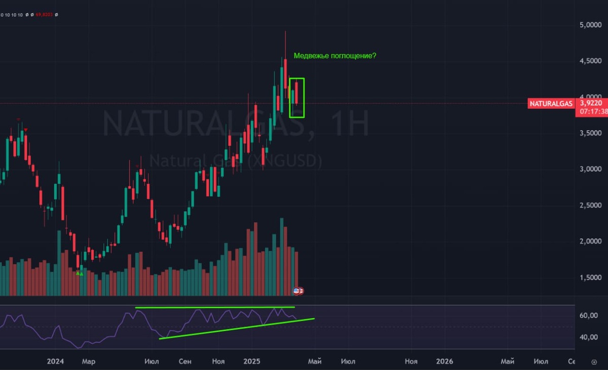 ⛽️ ГАЗ! 🟢 Эта дикая лошадь совершенно неуправляема! Сегодняшний слив образовал красную свечу медвежьего поглощения, что ставит лонговый сценарий под сомнение! Нужно смотреть как закроется недельная свечка. 🟢 По RSI у нас всё еще существует клин, о котором я рассказывал на видео. Выход из него точно будет, вопрос лишь в том, как это случится - сразу вниз или через 5,14. 🚗 Газ сегодня у меня выбил стоп. Я снова на заборе по газу. Очень сложный инструмент в своей сложной фазе в период глобальной неопределенности по рынку. #Газ #NG #американскийгаз #Фьючерсгаза #naturalgas #bogdanoffinvest