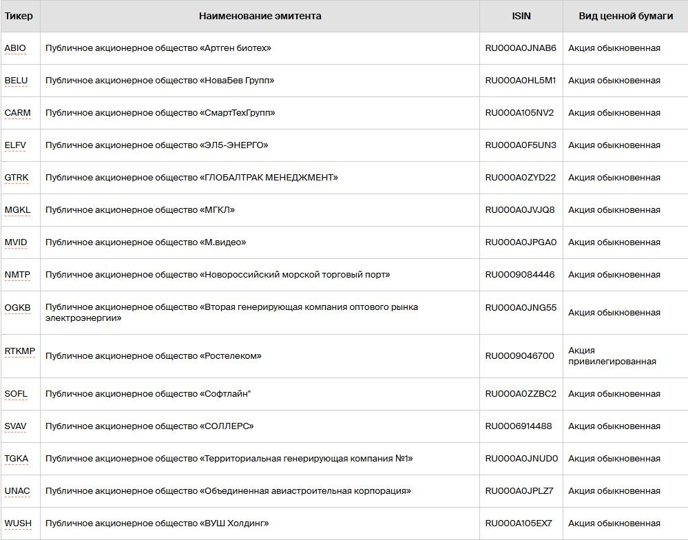 14 из них — обыкновенные акции, 1 — привилегированная (ПАО «Ростелеком»). В общей сложности количество ценных бумаг для торговли увеличивается до 70.