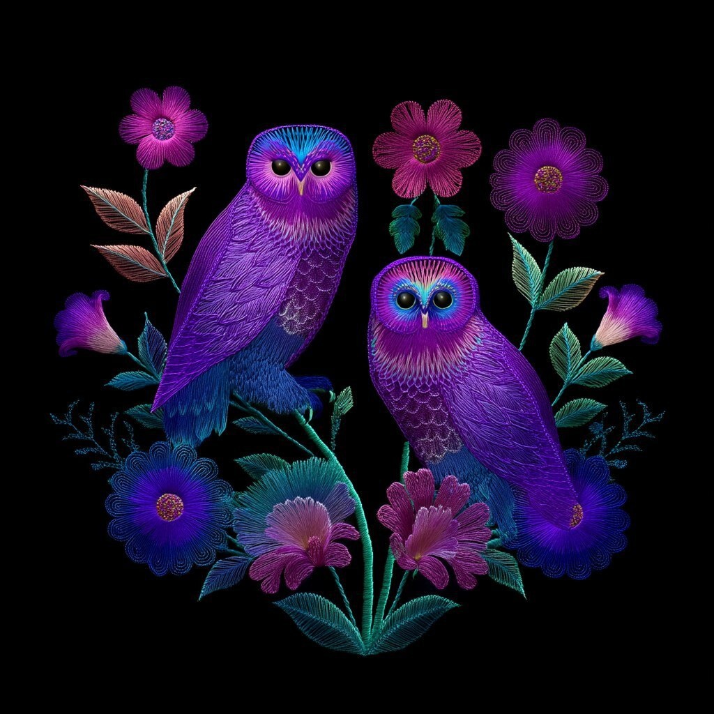 Создано на основе запроса: fiber optic floral owls in swedish folk art style, purples, blues, pinks, green accent color, ethereal rendering