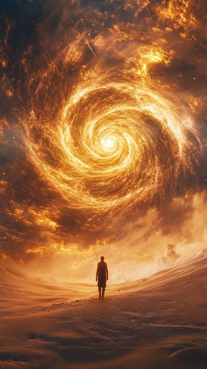 Создано на основе запроса: A person walking through the desert, with an elaborate fractal spiral galaxy in the sky above, bright light emanating from the center of the nebula and swirling around like sun rays, in the style of fantasy art, with vibrant colors and a hyper-realistic style.