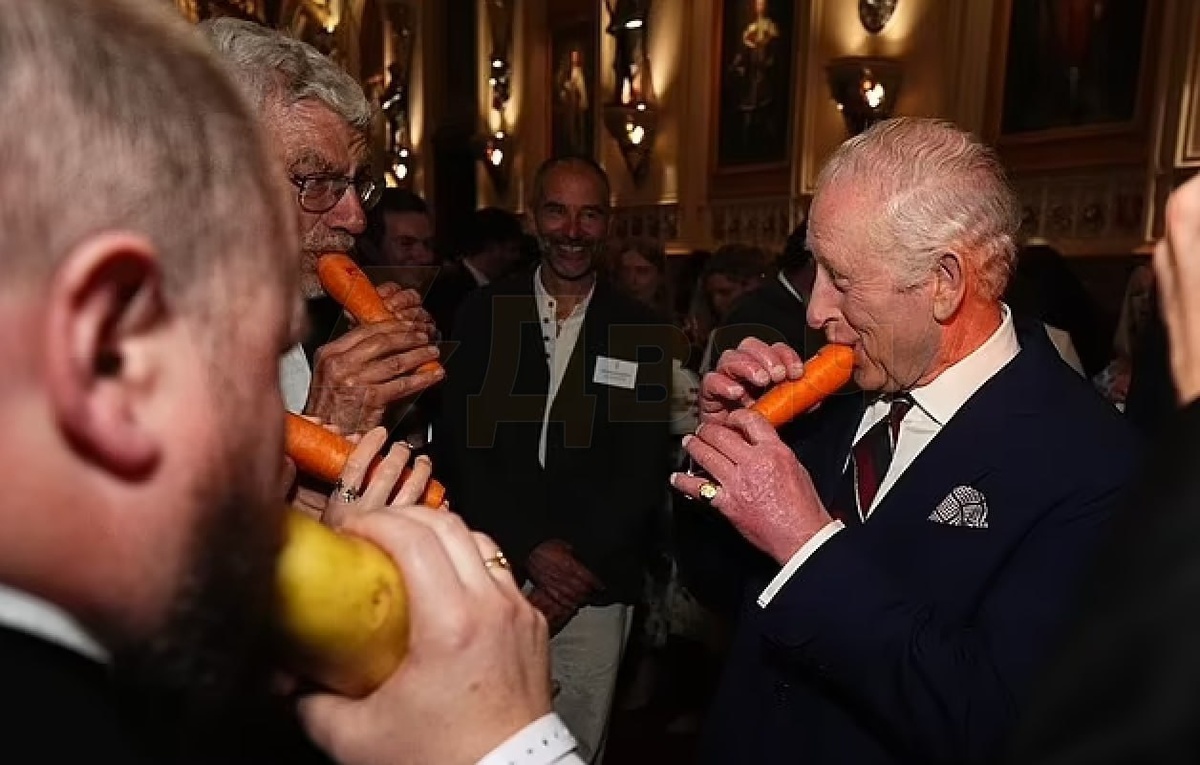 Карл III решил не оставаться в стороне и тоже попробовал поиграть на необычном инструменте. Он выбрал морковь и просвистел на ней английскую колыбельную.