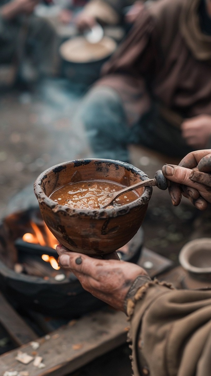 Создано на основе запроса: POV sitting on wooden bench, both hands holding a clay bowl with porridge, dipping spoon into it, surrounded by Roman soldiers eating, faint smoke from campfire in background --- Автоперевод: Пов сидит на деревянной скамейке, обе руки держали глиняную миску с кашей, погружая в нее ложку, окруженные римскими солдатами, слабым дымом от костра в фоне Как тебе генерация? 🤔 https://dzen.ru/id/65c0c65c86e4f837c27b24d7 #ИИ #AI #нейросеть #midjourney #art