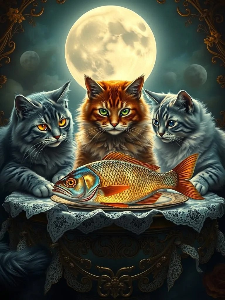 Create a detailed fantasy oil painting inspired by the works of Konstantin Vasiliev. Depict three cats sitting at a table eating one large fish. The scene should reflect a surreal atmosphere, with each cat displaying unique characteristics and expressions as they interact with the fish. Use intricate details and rich colors to bring this whimsical painting to life. 8K, HDR #neuroart #нейроарт #ai #ии #нейросеть #картинки #искусственныйинтеллект #цифровоеискусство #digitalart #арт #art #prompt #промпт #подсказка