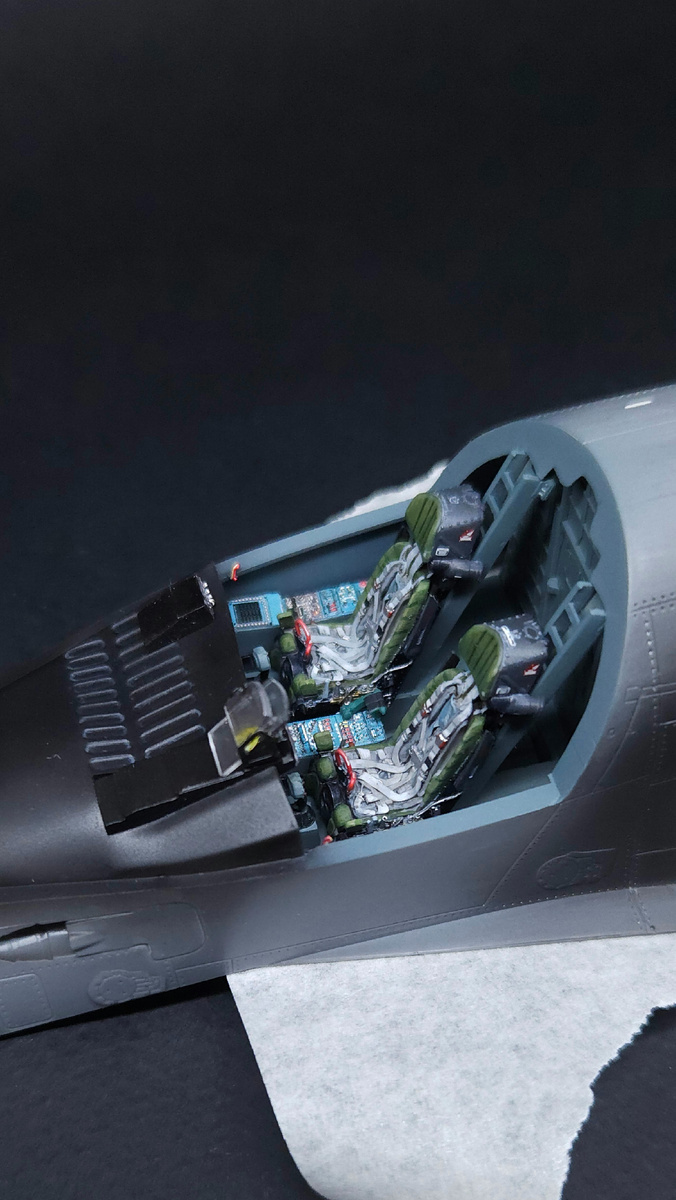 Всем привет! Продолжаю работы с моделью самолёта Су-34 в масштабе 1/48 от фирмы Kitty Hawk. В этой части расскажу и покажу небольшие подсборки пластика модели. Традиционно любая сборка модели самолёта начинается с кабины. Сам набор предлагает очень ( ну ОЧЕНЬ) упрощённую кабину. Нет ни вменяемых кресел, ни пультов за креслами, ни шторок на фонаре, хотя фонарь на модели большущий. В моём же случае, улучшать ее нету времени, да и ТЗ заказчика этого не требует. Поэтому применил только сокращённый набор от QuintaStudio и катапультные кресла от TempModels. P.S. после работы с кабиной от Су-30СМ поменялось представление о том, какая должна быть кабина. Планка поднялась. Далее подсборки ниш. Если в нишах основных стоек производитель постарался дать хоть какие-то элементы трубопроводов, то в нише передней он просто забил. Нет НИ-ЧЕ-ГО. Воздухозаборники также собрал, покрасил внутри. Теперь перехожу к деталям планера. Воздухозаборники были собраны и установлены на свои места. Установку произ