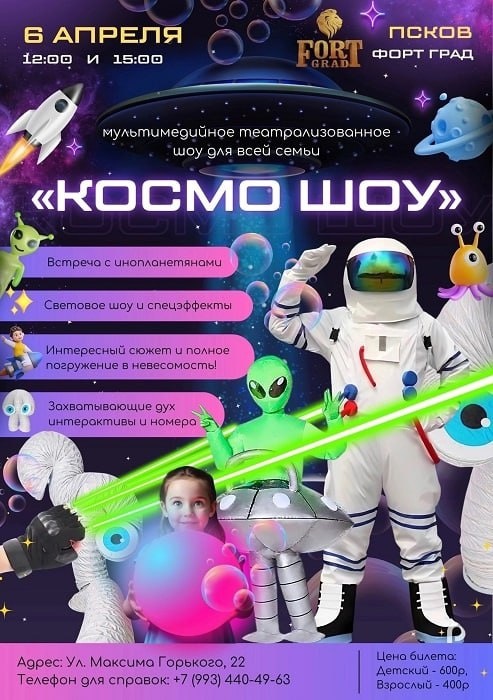 КОСМОС Театрализованное шоу для всей семьи 🪐 ✨ Фантасмагория на тему путешествия в открытый космос. 💫 Каждый ребёнок становится не просто зрителем, а участником представления. Именно от зрителей зависит исход путешествия, ведь дети будут погружены в незабываемую атмосферу, с яркими героями, космонавтами, пришельцами и другими персонажами. ⚡️ В шоу включены интерактивы с залом, мультимедийные задания и проекции, яркие номера, лазерное шоу, звуковые и световые спец эффекты! 📆 6 апреля в 12.00 и в 15.00 📍 крепость Форт Град Максима Горького 22 🎟 Билеты 12:00 🎟 Билеты 15:00 Оставайтесь с нами #НашаПсковскаяобласть #шоу