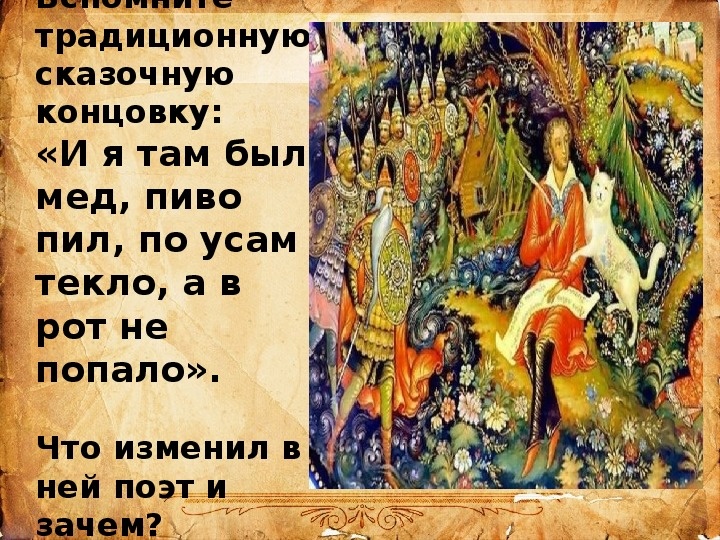 Фраза «и я там был, мед-пиво пил, по усам текло, а в рот не попало» заключает в себе волшебство переходной грани между миром фантазий и реальной жизнью. Эти слова, словно магический ключ, открывают двери из сказки обратно в обыденность. Они завершают многие произведения, придавая им ощущение полноты и гармонии. Например, Николай Алексеевич Островский использовал эту фразу в своем творчестве, а Владимир Даль включил её в «Хлебные дельцы. Картины русского быта». Александр Сергеевич Пушкин также обращался к этому приёму, особенно ярко он проявляется в «Сказке о Кузьме Остолопе»: «Я там был; мед, пиво пил — и усы лишь обмочил». Пётр Павлович Ершов, вдохновляясь традициями народного эпоса, завершил свою знаменитую сказку «Конек-горбунок» похожей фразой, которая перекликается с древнегреческой поговоркой: «Губы обмачивает, но не небо». Но зачем эта фраза? Почему она стала столь популярной среди русских писателей? Всё дело в том, что сказочные истории отличаются от реальности. В мире фантази