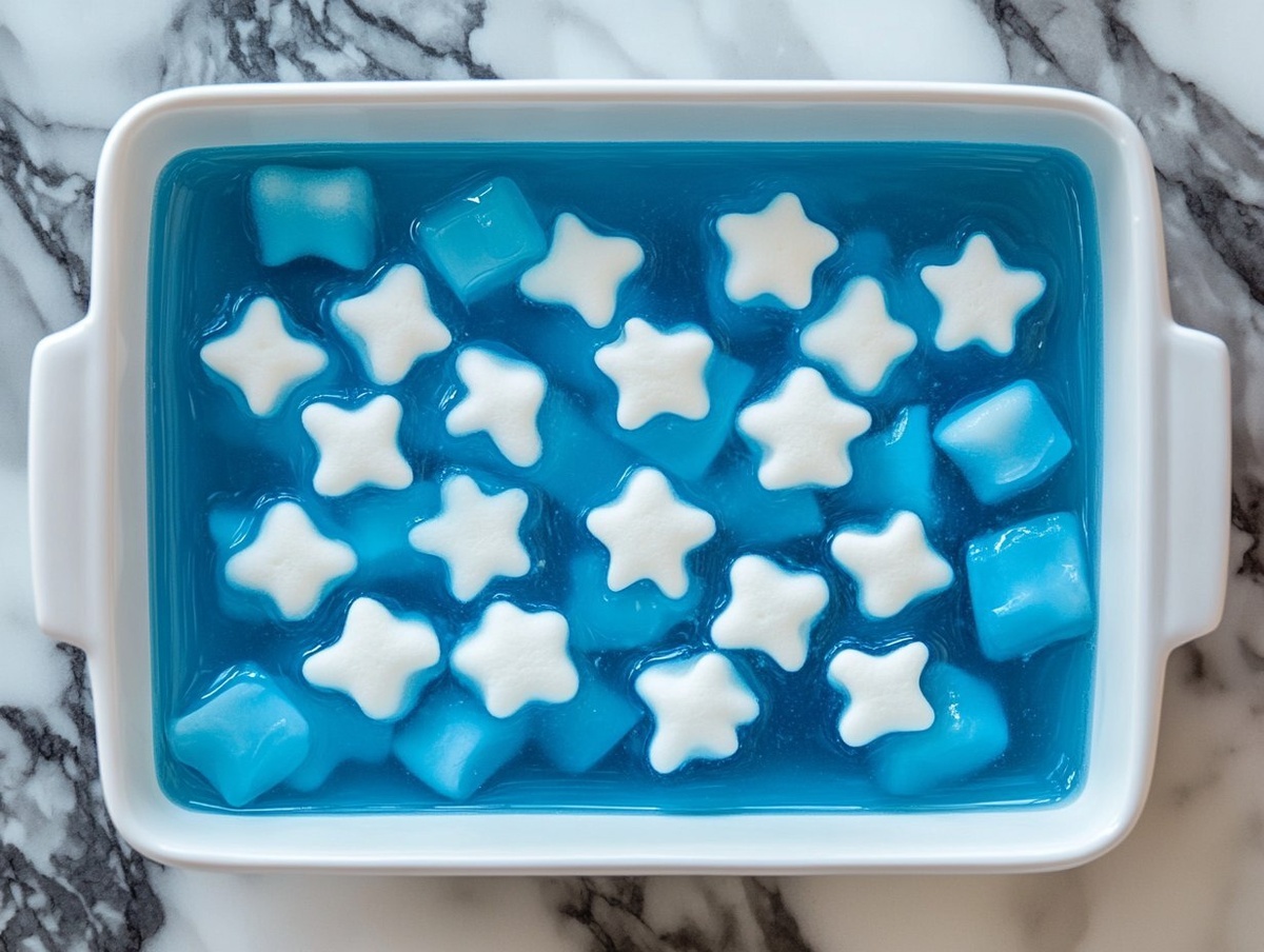 Создано на основе запроса: an overhead view of a rectangular white ceramic dish filled with blue jello