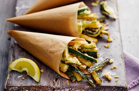 Работая партиями, используйте шумовку, чтобы окунуть несколько цуккини в тесто, стряхните излишки, а затем осторожно опустите в горячее масло. Жарьте в течение 2 минут, переворачивая, пока они не станут слегка золотистыми и хрустящими. Выньте шумовкой.