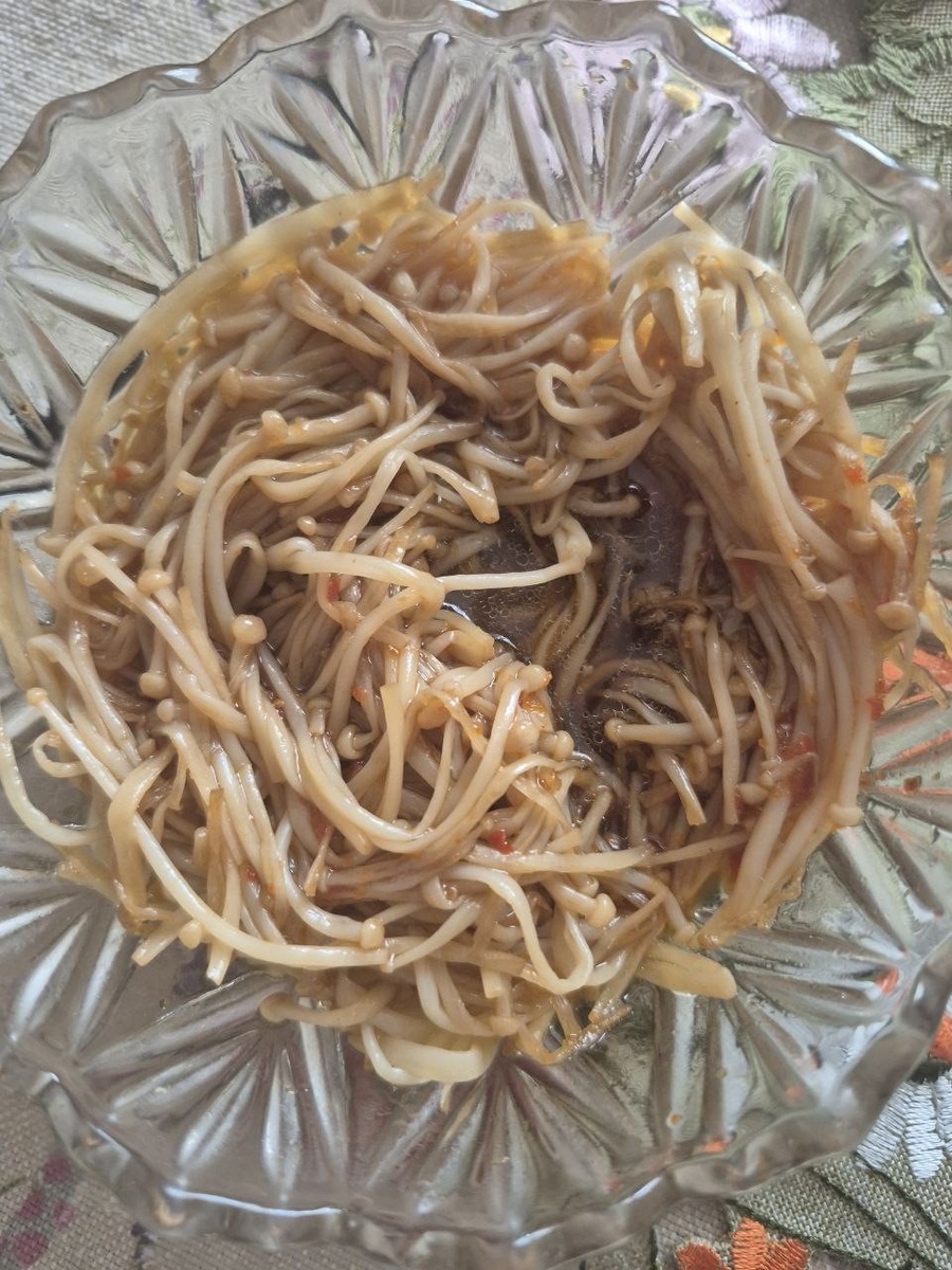 Грибы промываем под проточной водой. Отрезаем грибницу (примерно 1 - 1,5 см). Выкладываем на разогретую с маслом сковороду. Обжариваем на большом огне 3 - 5 минут, постоянно помешивая (я использовала 2 кулинарные лопатки). Выкладываем в розетку, ждем пока остынет. Готовим соус: смешиваем соевый соус, сладкий соус чили и мед. Остывшие грибы поливаем соусом. Эноки по-корейски готовы! Для приготовления я использовала: - 100 грамм эноки - 1 столовая ложка соевого соуса - 1 чайная ложка сладкого соуса чили (рецепт здесь: https://dzen.ru/a/Z8GZFS5rzH4gcXfL) - 1 чайная ложка меда - 1,5 чайных ложки топленого масла для жарки Очень необычно и вкусно! Съедается очень быстро! Приятного аппетита!